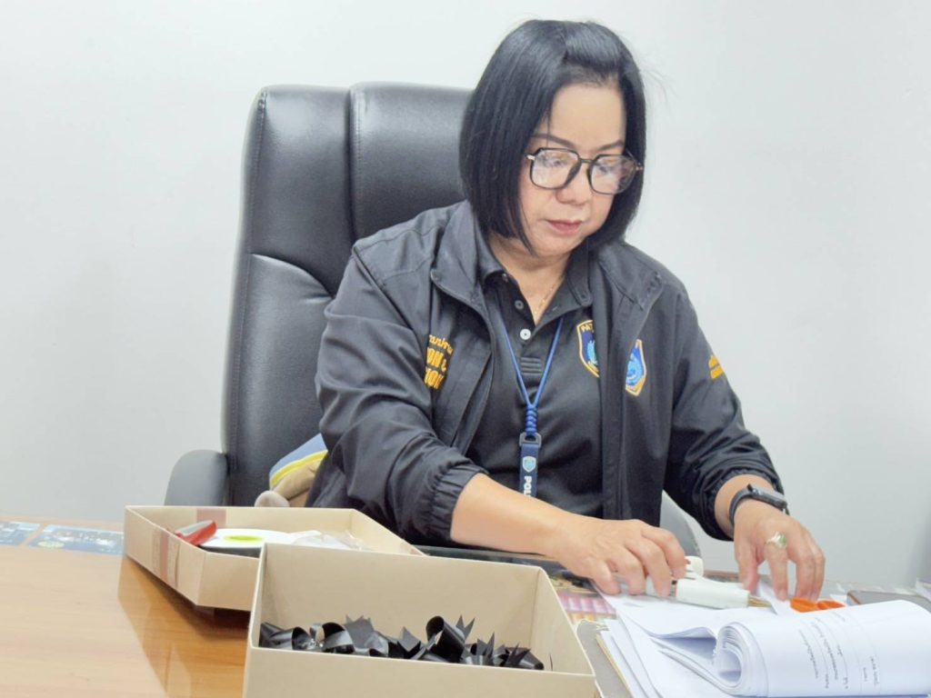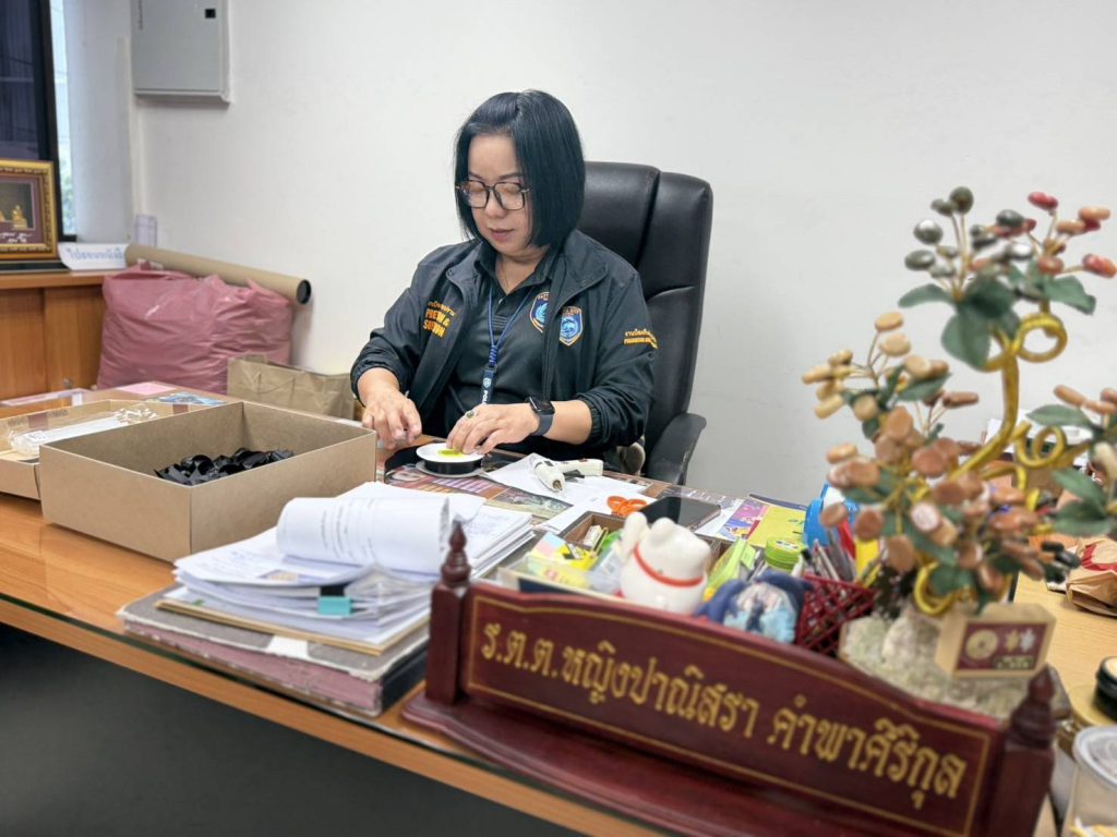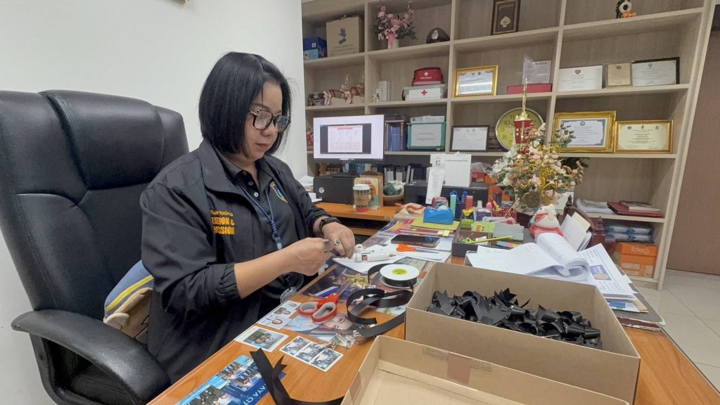 เลขาสาวโรงพักพัทยาอาลัยแม่ฟ้าหลวง จัดทำริบบิ้นดำแจกตำรวจ-ประชาชน