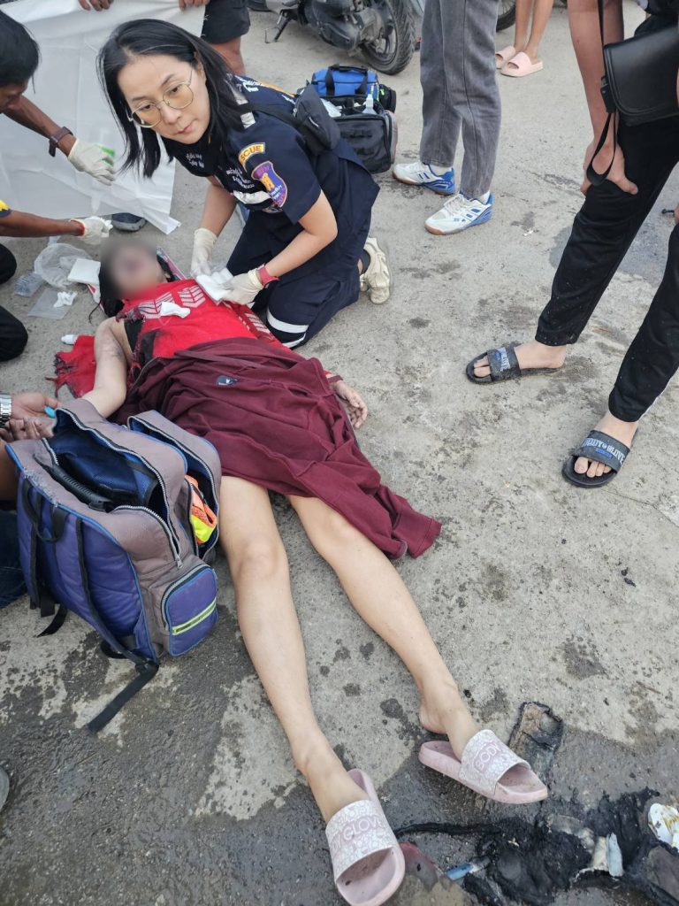 ในที่เกิดเหตุเจ้าหน้าที่กู้ภัยได้ทำการปฐมพยาบาลและนำผู้ได้รับบาดเจ็บส่งรักษาต่อที่โรงพยาบาลเป็นที่เรียบร้อยแล้ว โดยผู้ได้รับบาดเจ็บเป็นผู้หญิง อายุ 22 ปี ได้รับบาดเจ็บเป็นแผลไฟไหม้บริเวณใบหน้าและบริเวณลำตัว เป็นแผลพุพอง และยังพบพาวเวอร์แบงก์ โทรศัพท์มือถือ และกระเป๋าและเอกสารต่างๆของผู้บาดเจ็บ ถูกไฟไหม้ได้รับความเสียหาย
