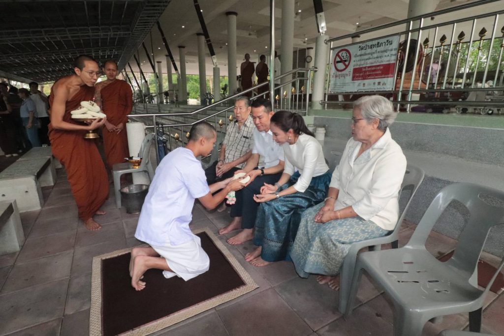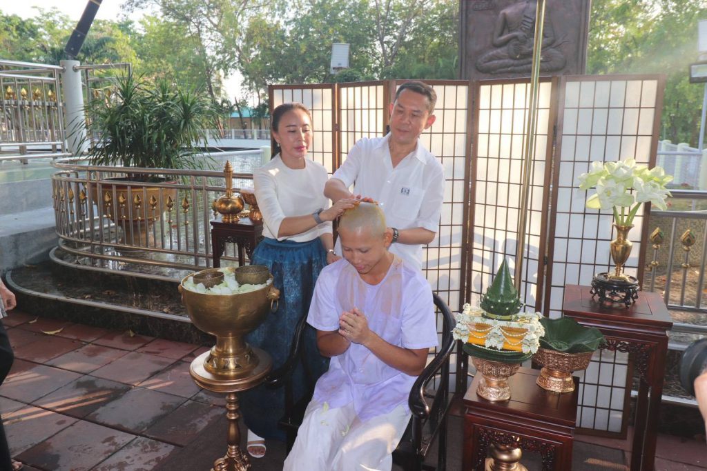วลา 16.00 น. วันที่ 18 มีนาคม 2569 ที่วัดป่าสุทธิภาวัน พัทยา จ.ชลบุรี ครอบครัวธีระพรสถานนท์ โดย นายศักดิ์สิทธิ์ ธีระพรสถานนท์ หรือ เสี่ยสม (บิดา) นางศิดารัศ รักธรรมสงบ (มารดา) ผู้บริหารโครงการเอสพีกรุ๊ป พัทยา ให้การต้อนรับกลุ่มสาธุชนจำนวนมากที่ทยอยร่วมพิธีปลงผมนาคปริ้นซ์-ณัฐภัควัฒน์ ธีระพรสถานนนท์ (บุตร) ในโอกาสอุปสมบทเข้าร่มกาสาวพัสตร์ตอบแทนพระคุณบิดา-มารดา